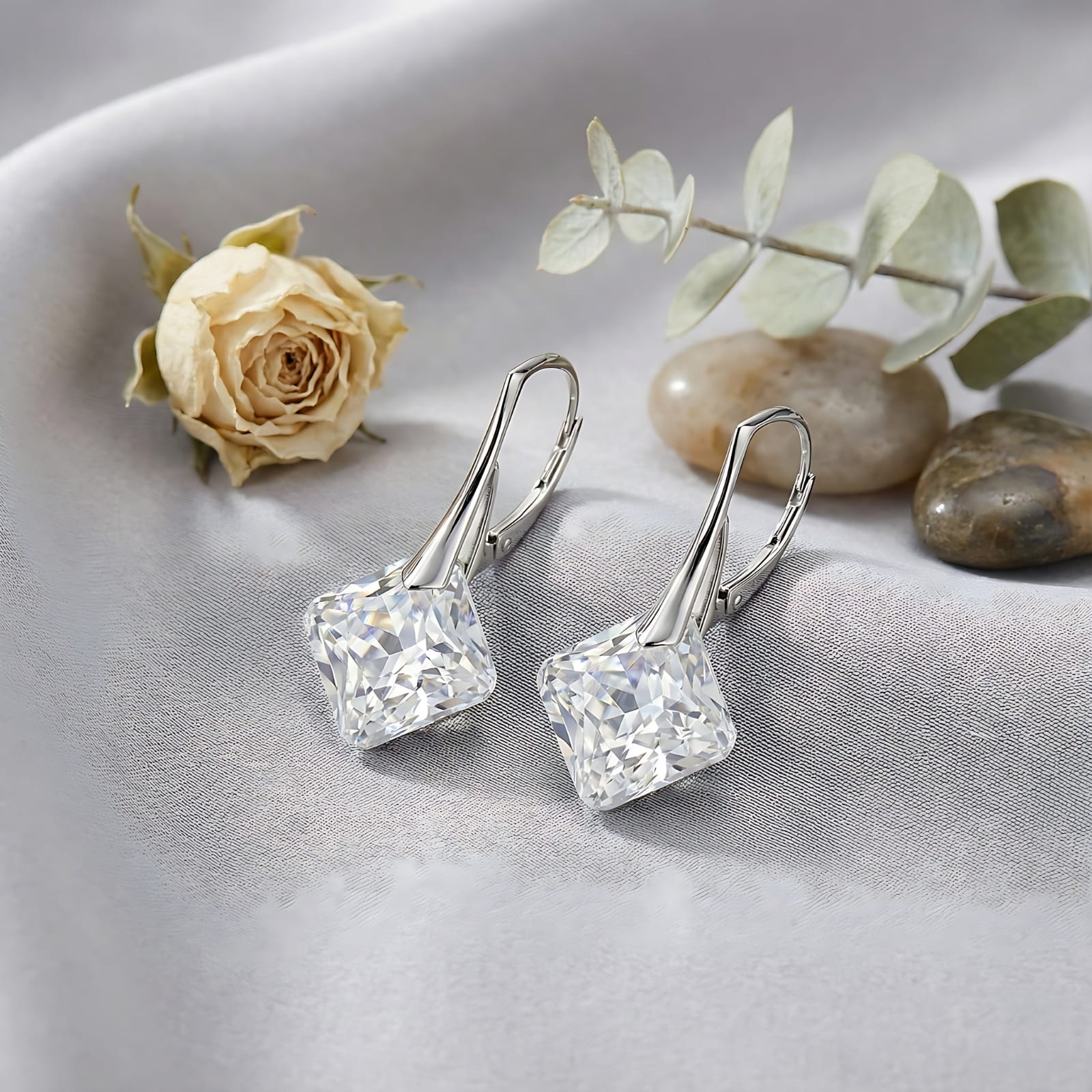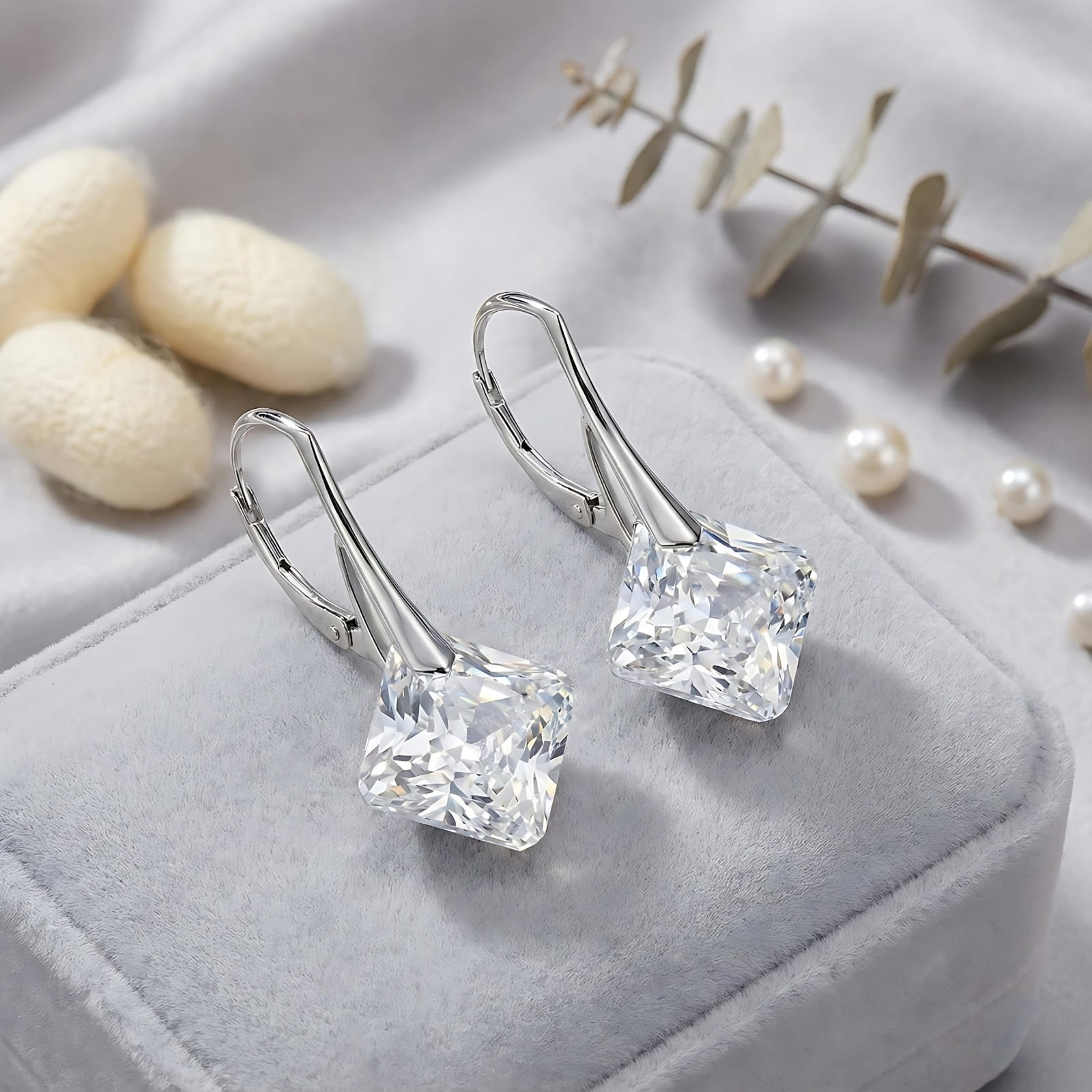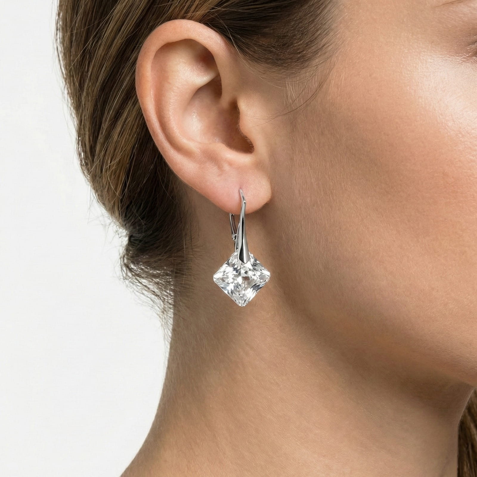 Przezroczyste kryształy w tych kolczykach zachwycają czystością i wyjątkową grą światła – każda faseta odbija refleksy, tworząc efekt świeżości i szlachetnego blasku. Geometryczna forma podkreśla nowoczesny charakter, a jednocześnie pozostaje niezwykle uniwersalna, dzięki czemu biżuteria pięknie komponuje się z różnymi stylami.