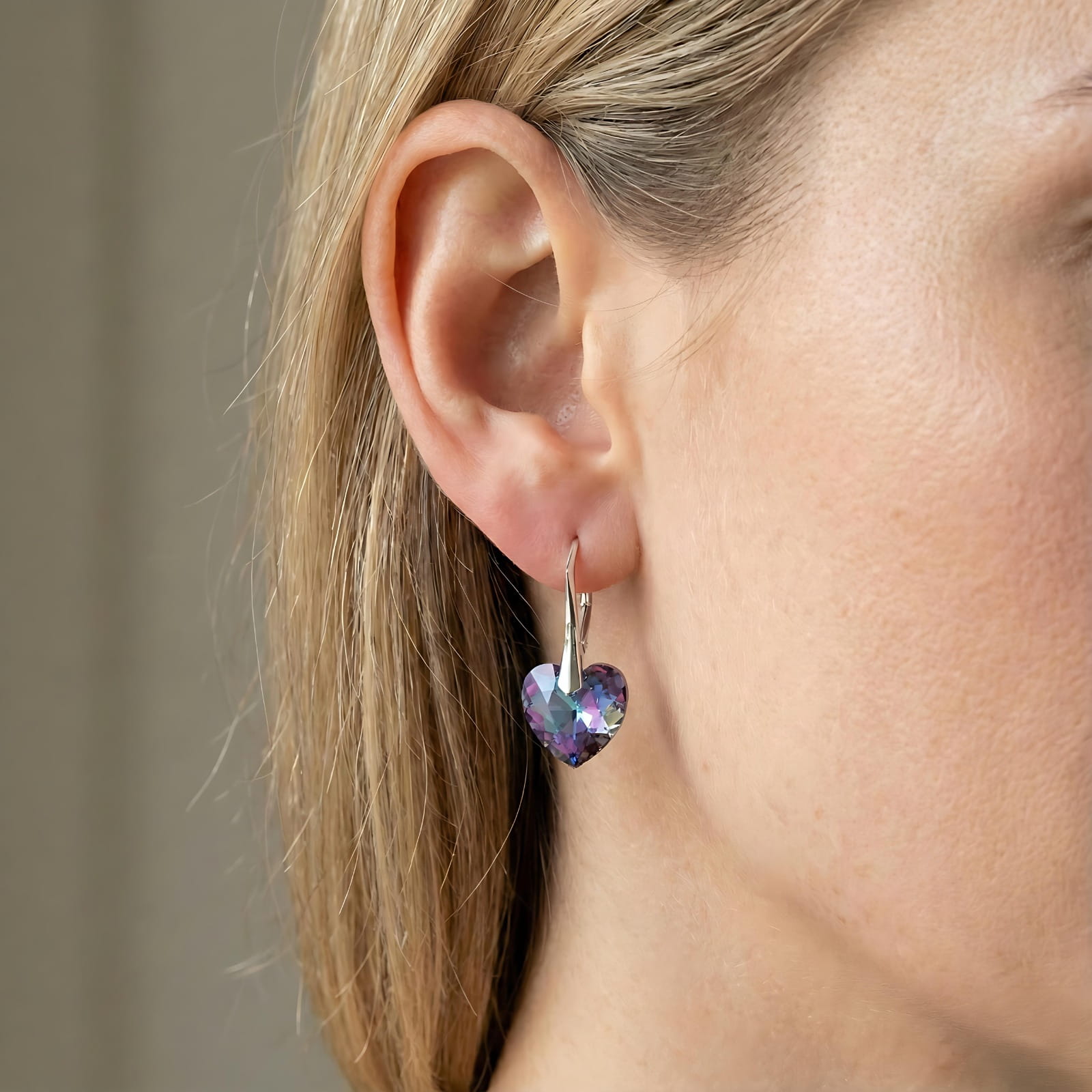 Dopracowane zapięcie angielskie zapewnia wygodę oraz stabilne trzymanie na uchu, a smukła forma pięknie wysmukla szyję. Szlif serca podkreśla głębię kryształu i sprawia, że kolczyki „żyją” w ruchu, delikatnie migocząc przy każdym kroku. Taki detal świetnie pasuje zarówno do minimalistycznych zestawów, jak i do bardziej wyrazistych stylizacji, gdzie liczy się nowoczesna biżuteria i dopracowany akcent.
