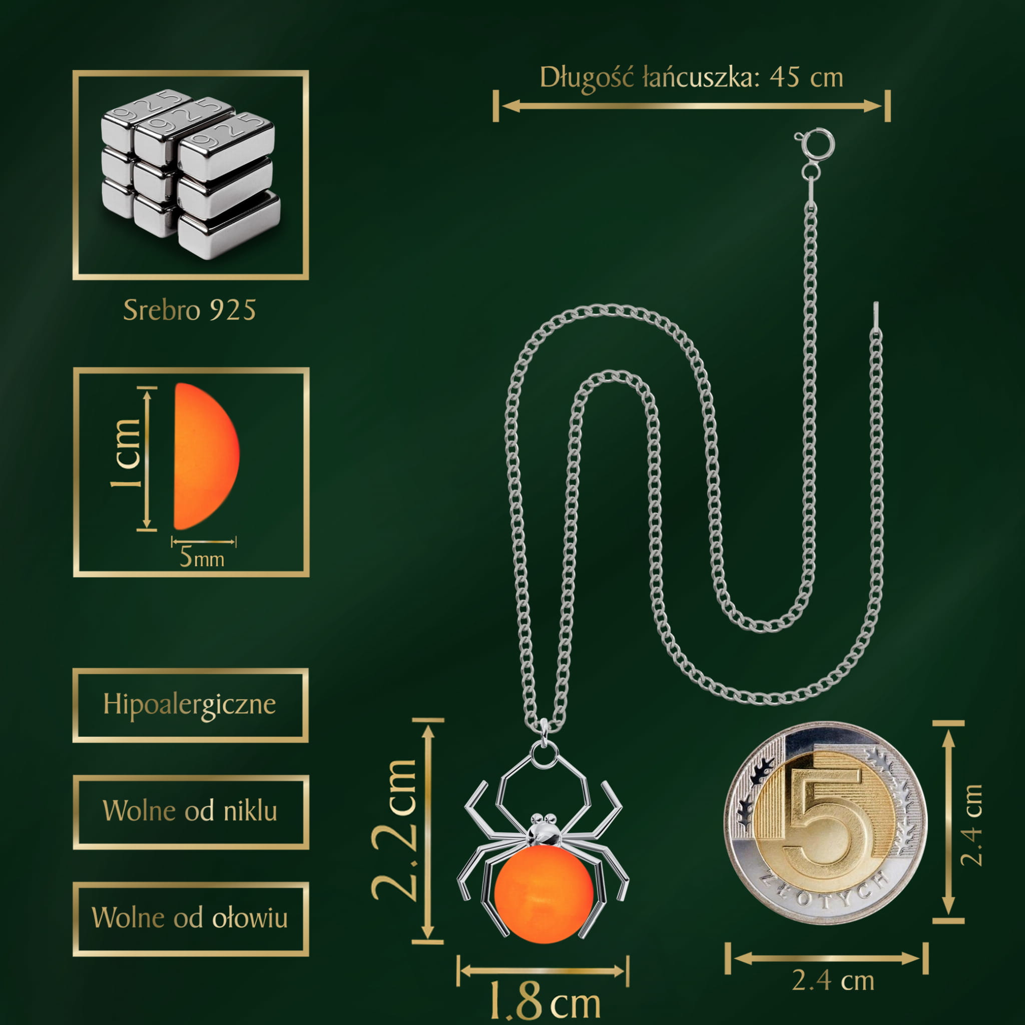Dopracowane detale konstrukcji sprawiają, że biżuteria przyciąga uwagę i zachwyca precyzją wykonania. Pająk o starannie odwzorowanych liniach oplata pomarańczowy kamień, tworząc niepowtarzalny efekt. Delikatny łańcuszek ze srebra próby 925 podkreśla całość, nadając lekkości i elegancji. Dzięki swojej formie naszyjnik jest wygodny w noszeniu i doskonale dopasowuje się do różnych stylizacji.