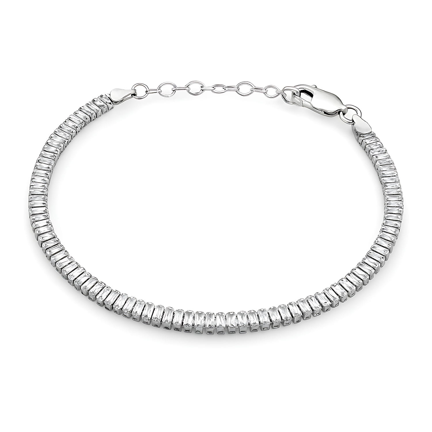 • Ta srebrna bransoletka damska to klasyka w nowoczesnym wydaniu. Delikatny, równy sznur prostokątnych cyrkonii tworzy efekt eleganckiej bransoletki tenisowej, która pięknie układa się na nadgarstku i odbija światło przy każdym ruchu dłoni. Biżuteria srebrna tego typu sprawdza się zarówno w minimalistycznych stylizacjach, jak i w bardziej wyrazistych zestawach, podkreślając kobiecy charakter całego stroju.