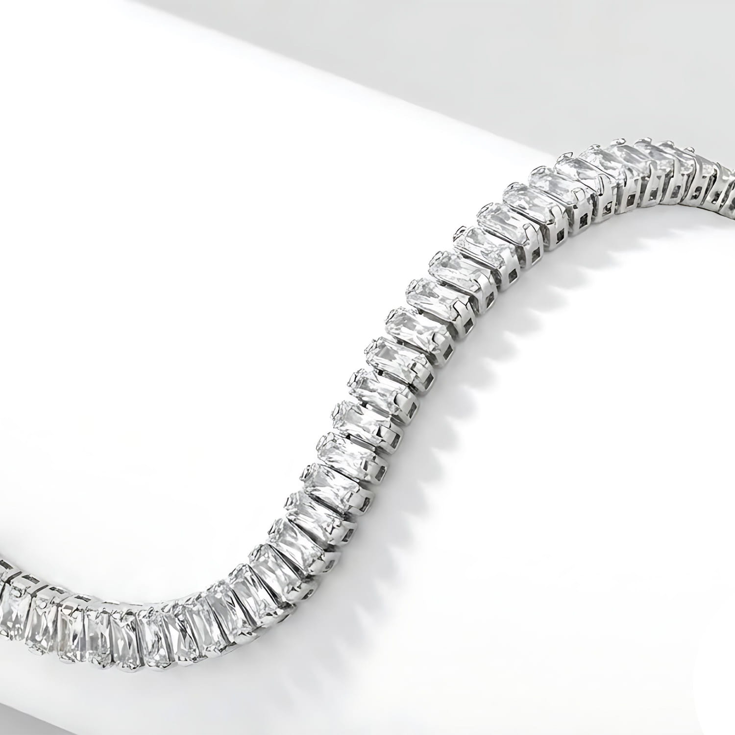 Bransoletka wykonana jest ze srebra 925, co gwarantuje trwałość, komfort noszenia oraz szlachetny połysk. Prostokątne cyrkonie zostały osadzone blisko siebie, dzięki czemu tworzą jednolitą, błyszczącą linię – to modny dodatek, który świetnie prezentuje się solo, ale można go również łączyć z innymi bransoletkami, tworząc własne kompozycje. Regulowane zapięcie pozwala dopasować długość do obwodu nadgarstka, zapewniając wygodę i pewność noszenia przez cały dzień.