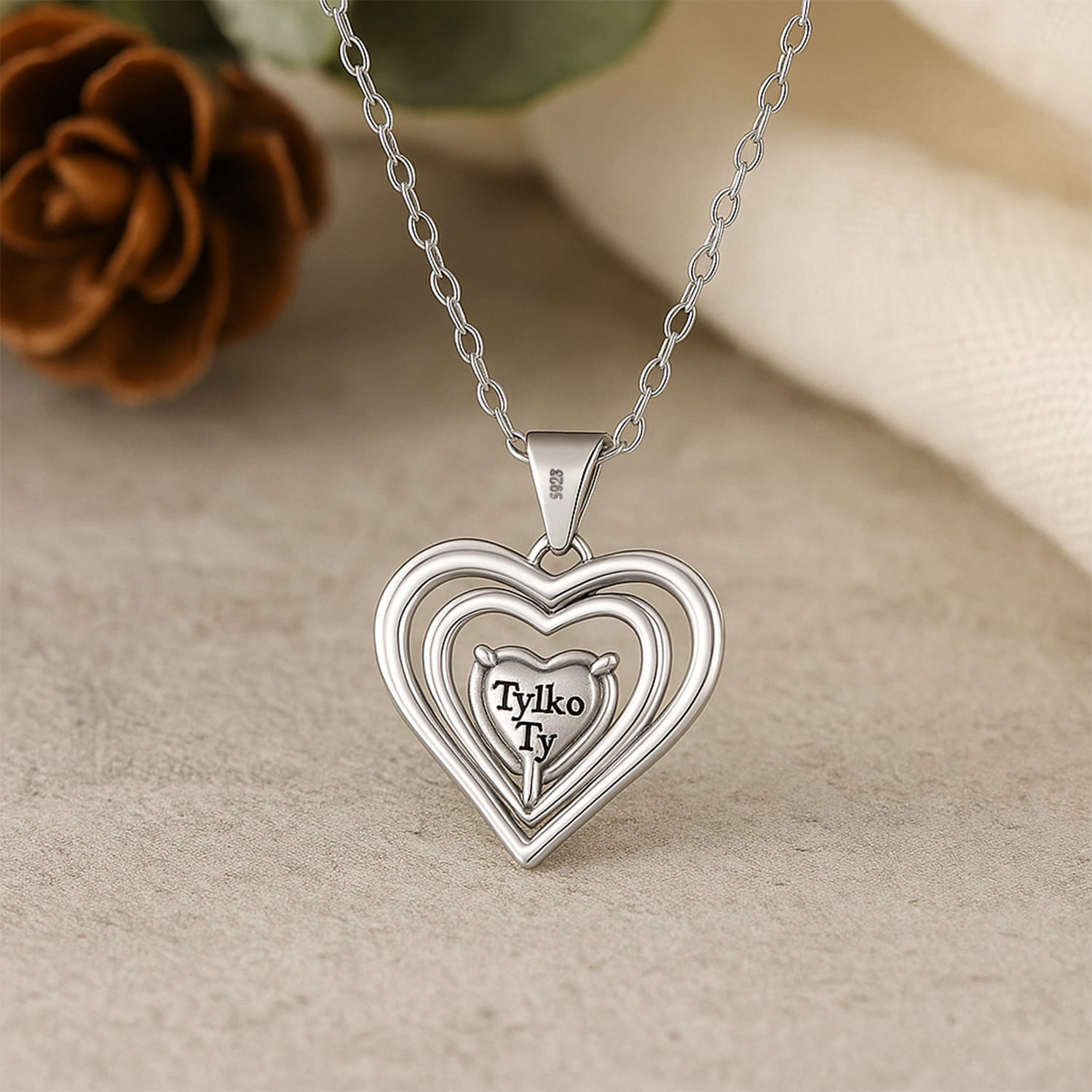 Zawieszka wykonana została z wysokiej jakości srebra 925, co zapewnia trwałość i komfort noszenia przez długi czas. Na odwrocie biżuterii kryje się grawer „Tylko Ty” – romantyczny akcent, który czyni ten projekt jeszcze bardziej wyjątkowym. To doskonały wybór zarówno jako symbol bliskości, jak i elegancki dodatek do codziennych stylizacji. Delikatny łańcuszek harmonijnie dopełnia kompozycję, tworząc lekki, ale wyrazisty efekt.