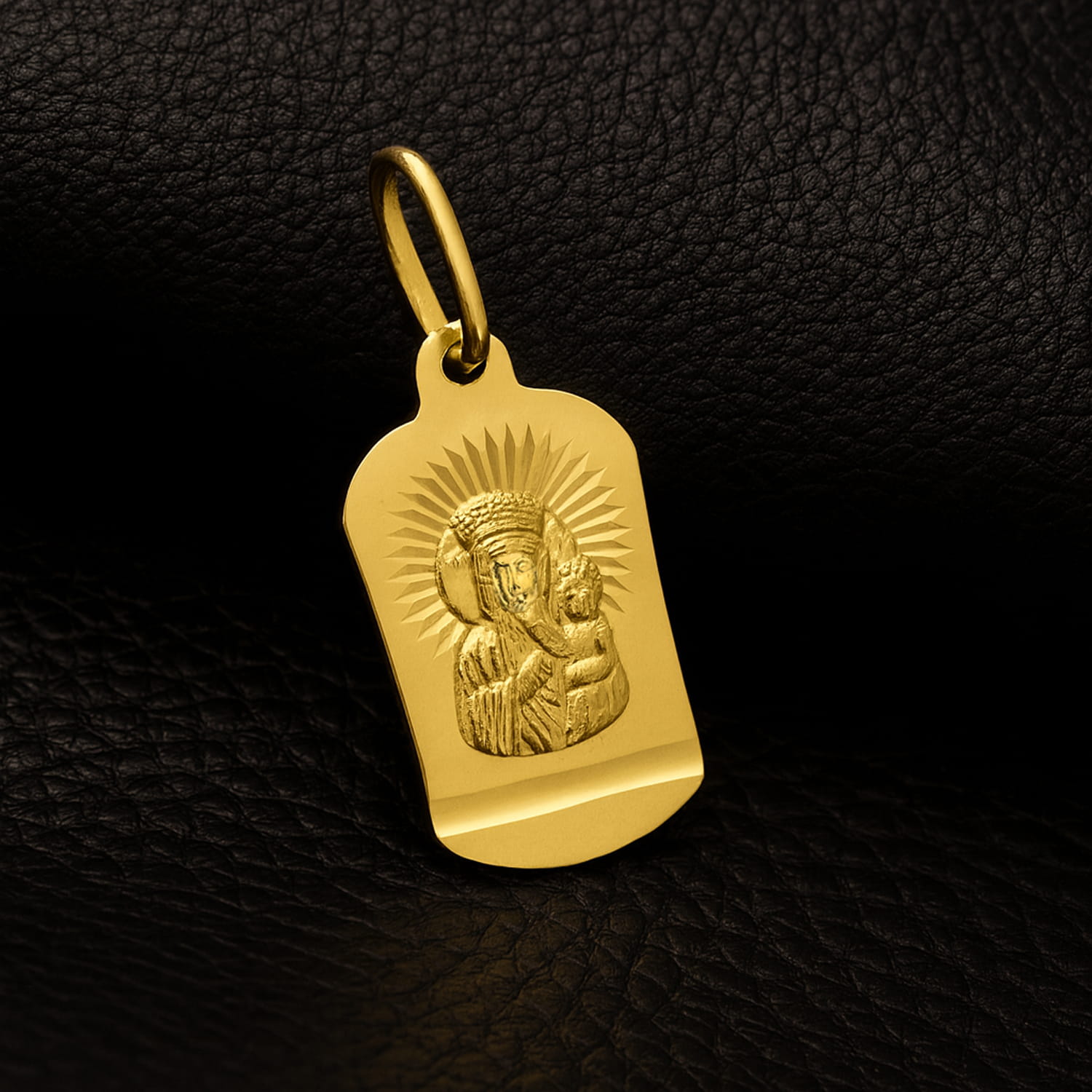 • Złoty medalik w formie papirusu przyciąga uwagę szlachetną formą i głęboką symboliką. W centralnym punkcie znajduje się wizerunek Matki Boskiej Częstochowskiej, otoczony promienistą aureolą, która subtelnie rozświetla całość. Wykonany ze złota próby 585, wyróżnia się starannym wykończeniem i trwałością, która sprawia, że może towarzyszyć przez wiele lat jako osobisty talizman.