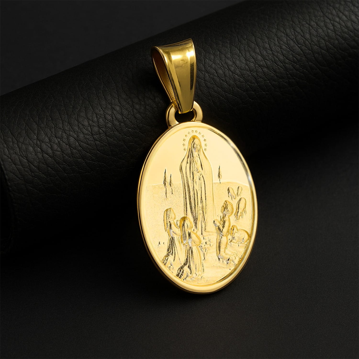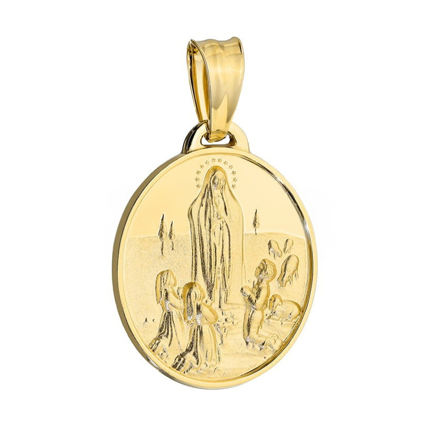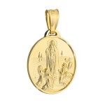 • Złoty medalik 585 z wizerunkiem Matki Boskiej Fatimskiej to wyjątkowa biżuteria religijna o głębokiej symbolice i eleganckiej formie. Okrągła zawieszka przedstawia scenę objawienia w Fatimie, starannie odwzorowaną z dbałością o każdy detal. Połączenie subtelnego reliefu z gładką, błyszczącą powierzchnią sprawia, że medalik emanuje ponadczasowym pięknem i duchowym znaczeniem.